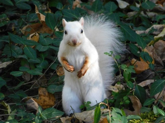 We recently caught a photo of this little guy after he enjoyed a walnut snack and it got us thinking: White squirrels are basically local…